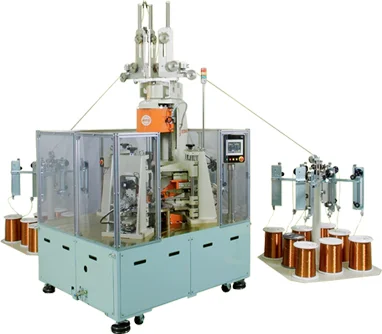Model HIM-03 has been developed for inside slot stator winding with a new technology "Hook Winding" which uses outward fingers to slide wires through stator slots instead of nozzles passing in the slot. The "hook" finger tool with NC control also allows for precision winding.